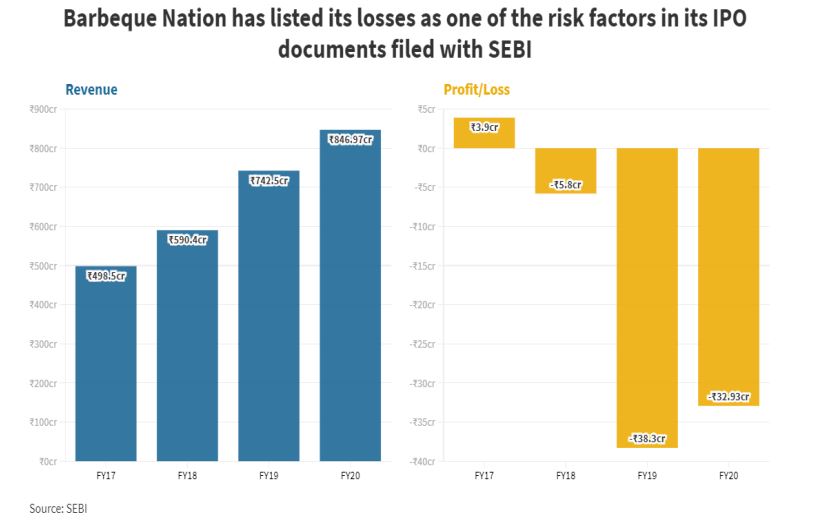 Barbeque Nation IPO Issue Price band is Rs 498 to Rs 500.Since the company has been incurring losses in the last 3 years and 8 months, has negative EPS